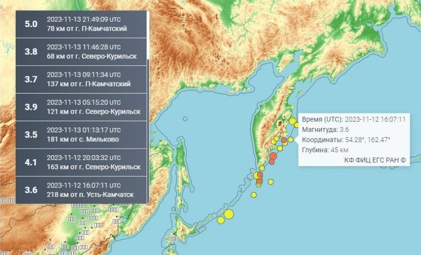По данным Единой геофизической службы, за прошедшие сутки в относительной близости от поселений Камчатки произошло еще около четырех землетрясений амплитудой от 3,5 до 3,8 балла. Очаг самого сильного находится в 121 километре от города Северо-Курильск, самое маломощное – в 181 километре от села Мильково.