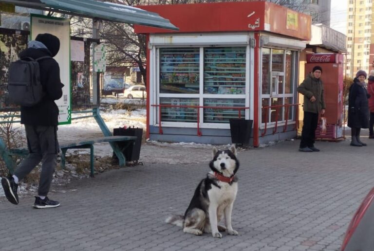 Возле остановочного павильона «Пенсионный фонд» сидит пес, похожий на представителя породы хаски или лайка. Пассажиры автобусов и прохожие обращают внимание на этого красавца. Он же невозмутимо продолжает оставаться на месте.