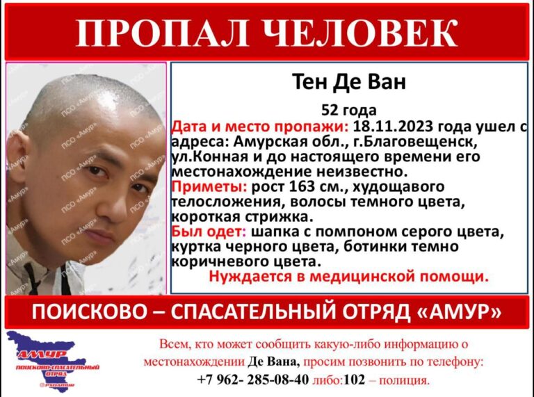 В Благовещенске пропал 52-летний гражданин Китая Тен Де Ван. Мужчина ушёл с адреса на улице Конной 18 ноября. О поисках рассказал поисково-спасательный отряд «Амур».