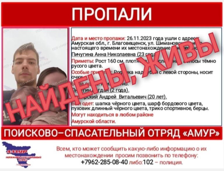 Но как выяснилось сейчас, ранее в Благовещенске молодая семья обратилась в центр помощи людям, оказавшимся в сложной жизненной ситуации. Об этом корреспонденту Амур.инфо рассказали в ПСО «Амур». Из благовещенского центра их отправили в центр помощи Хабаровска, потому что там более комфортные условия для проживания с ребенком. Руководитель благовещенского центра увидел ориентировку, связался с ПСО и все рассказал поисковикам. В настоящее время молодые люди остаются в Хабаровске.