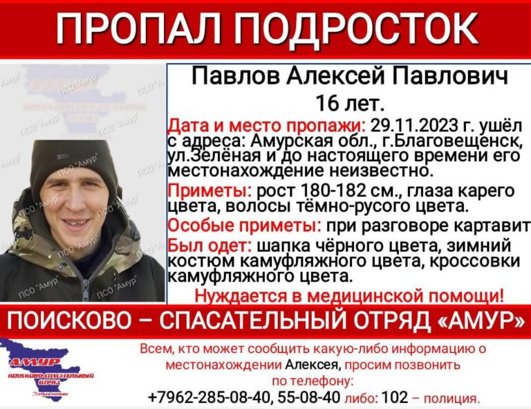 Любую информацию, которая может помочь в поисках молодого человека, сообщайте в поисково-спасательный отряд «Амур» по телефону +7-962-285-08-40 либо в полицию по телефону 102.
