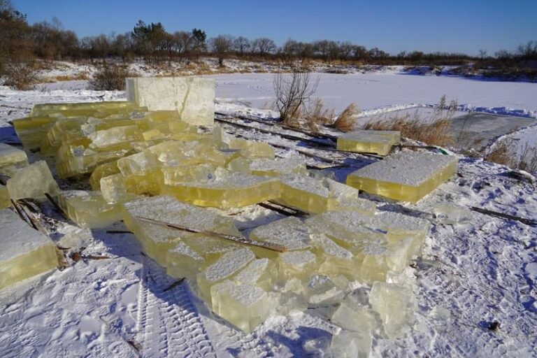 Строители после вырезки из водоёма кубов для ледовых фигур оставили их на берегу, чтобы те покрылись «паутинкой». Однако когда рабочие прибыли за новой партией «стройматериала», то нашли его разрушенным.