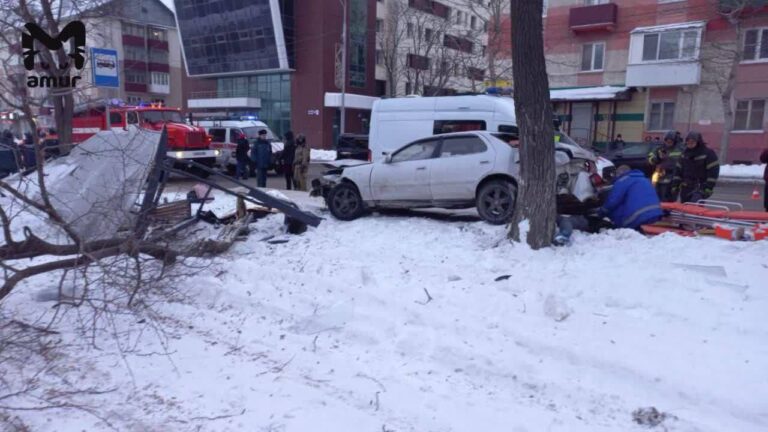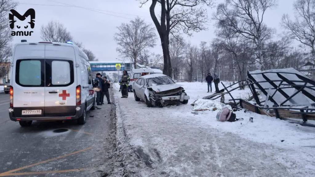 В центре Южно-Сахалинска иномарка врезалась в автобусную остановку: много жертв