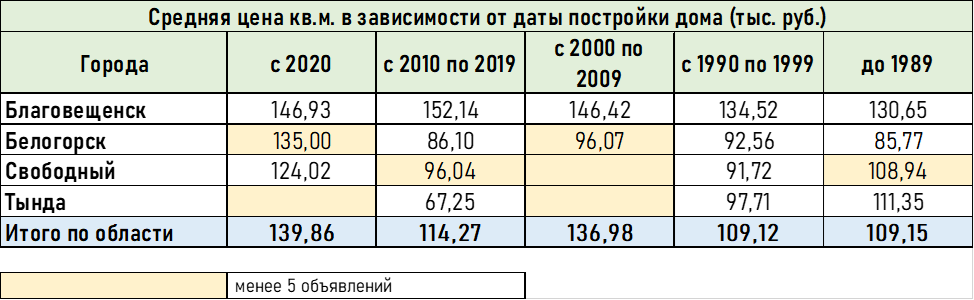Так, самый дорогой «квадрат» на квартиры в домах с 2010 по 2019 год постройки в Благовещенске – 152,14 тысячи рублей. В Белогорске максимальные цены на квартиры в домах, построенных в интервале с 1990 по 1999 год (92,56 тысячи рублей). В городе президентского внимания «бьют рекорды» квартиры в новостройках. А в Тынде, как ни удивительно, самый дорогой старый жилой фонд (до 1989 года постройки) – 111 350 рублей за «квадрат».