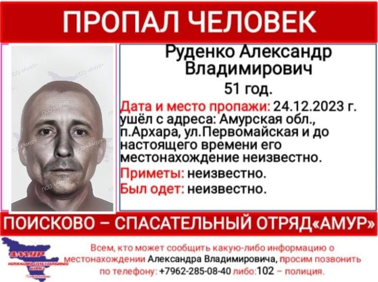 В Архаре разыскивают 51-летнего Руденко Александра Владимировича. О поисках сообщил поисково-спасательный отряд «Амур».
