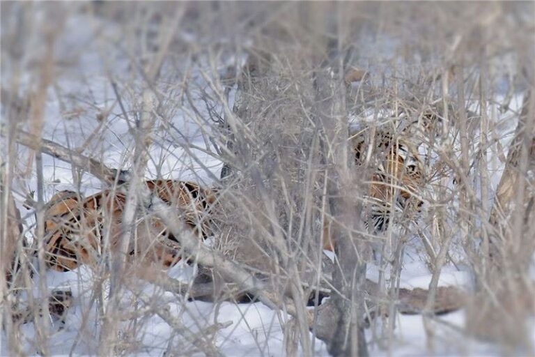 Зверь был примерно в 30 метрах от группы исследователей и журналистов и позволил им сделать несколько снимков. Об этом сообщает Центр «Амурский тигр» со ссылкой на сайт hubaogy.cn.