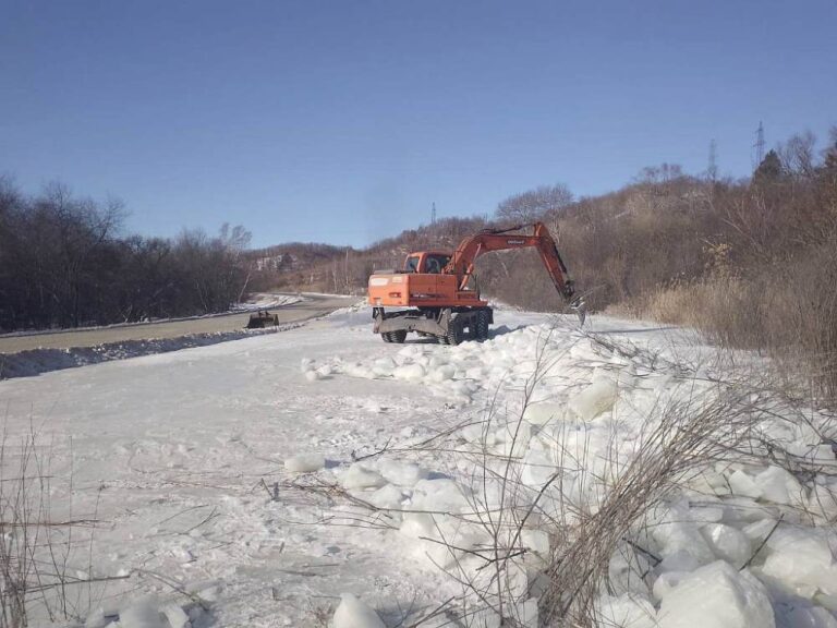 На участке, где образовалась опасная наледь, выставлены предупреждающие знаки. Сейчас дорожники с помощью экскаваторов расчищают кюветы для отвода воды, потом грейдером планируют очистить дорогу от наледи.