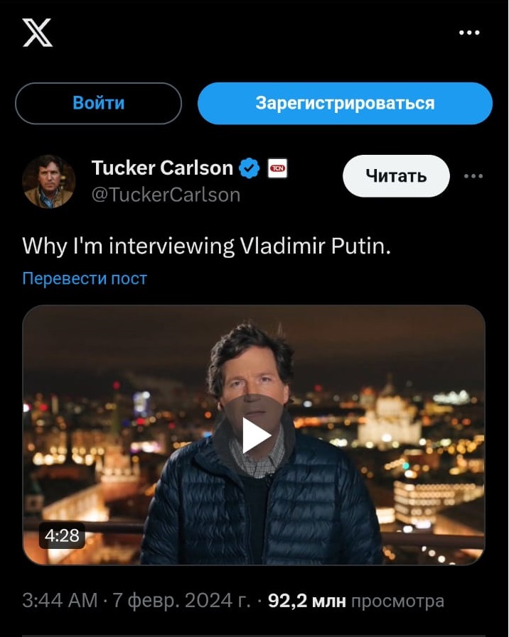 Отметим, что на утро 8 февраля анонс интервью с российским лидером в соцсети X собрал 92,2 миллиона просмотров. В нём Такер Карлсон сообщил, что возьмёт интервью у Путина, потому что американцы абсолютно не в курсе того, что происходит в России и на Украине. Американский журналист также заверил, что его команда сама оплатила поездку в Москву, он ни у кого не брал на это денег. При этом, по его словам, Белый дом дважды пытался сорвать интервью с Владимиром Путиным.