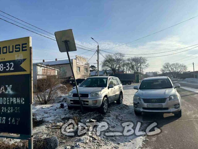 На обочине RAV4 повстречал дорожный знак и почти повалил его. Телеграм-канал назначил виновником ДТП водителя RAV4. Но, учитывая характер повреждений и то, что RAV4 от удара в левую дверь унесло с дороги вправо, всё не так однозначно. Поэтому, пока непонятно, кто из двоих заплатит десять тысяч рублей за порчу городского имущества – виновника установят сотрудники ГИБДД.