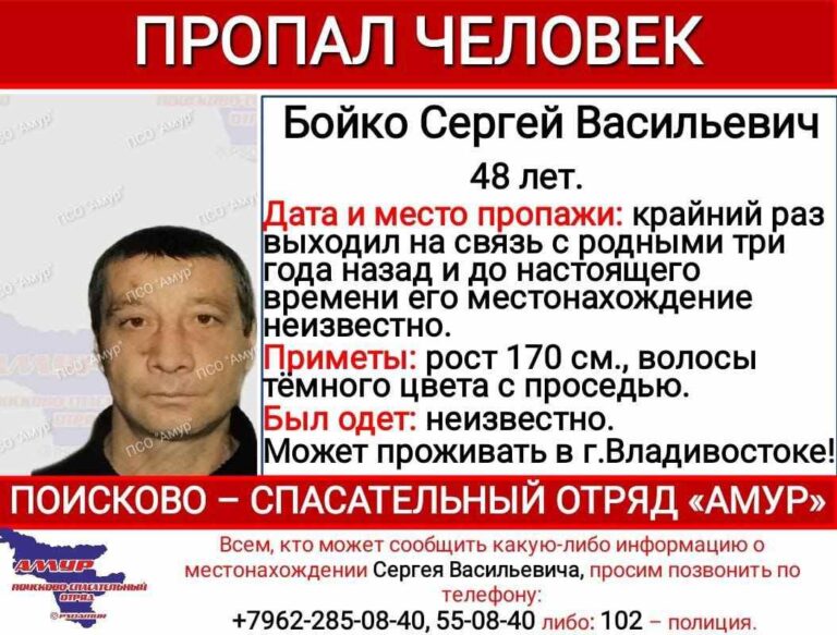 Уже три года ничего не известно о местонахождении Сергея Васильевича Бойко. Об этом сообщает поисково-спасательный отряд «Амур».