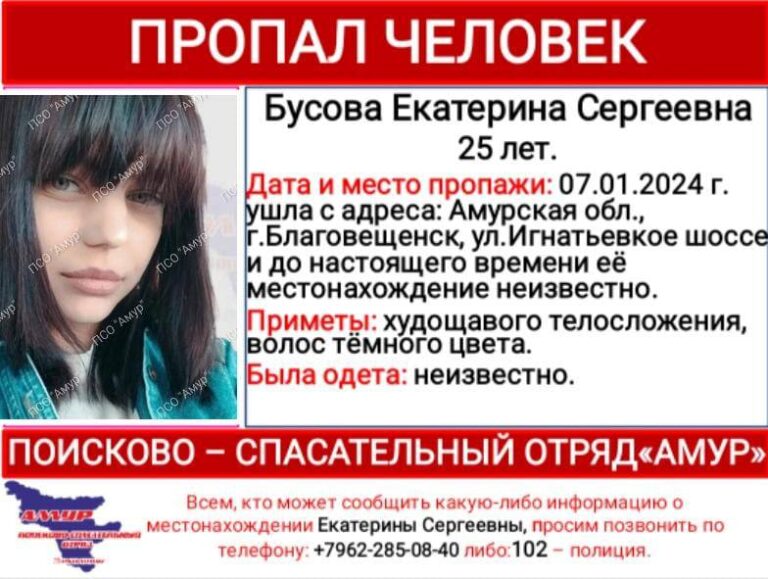 25-летняя Екатерина Бусова ушла из дома на Игнатьевском шоссе в Благовещенске еще 7 января 2024 года. До сих пор ее местоположение неизвестно. Об этом сообщили в поисково-спасательном отряде «Амур».