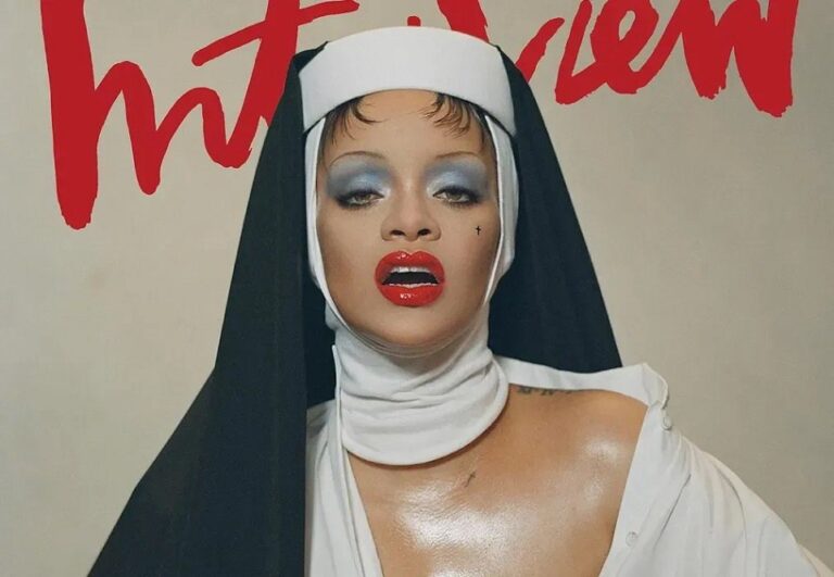 На обложке журнала Interview 36-летняя Рианна предстала в головном уборе, напоминающем аксессуар католических монахинь, а также в белой мокрой рубашке Dior, частично обнажающей грудь. Завершает образ певицы вульгарный макияж с голубыми тенями и красной помадой.