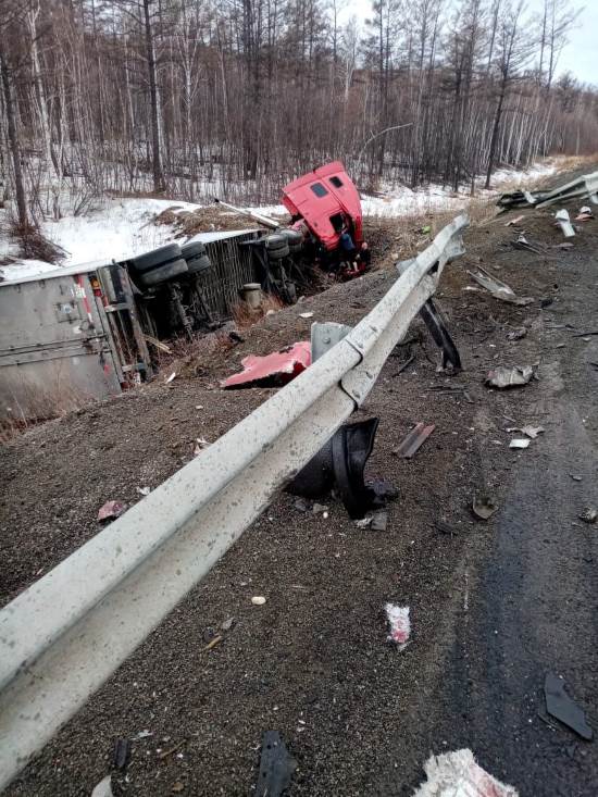 — Сегодня, 12 апреля 2024 года, в утреннее время на 783 км+50м ФАД «Амур» Сковородинского муниципального округа водитель грузового седельного тягача марки «Volvo VNL», не выбрав безопасную дистанцию, допустил столкновение с движущимся навстречу автомобилем «КамАЗ», в результате чего произошло столкновение. В КамАЗе находилось 13 человек, в том числе водитель, – сообщили в ведомстве.