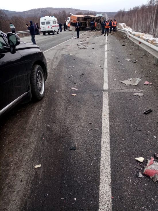 «В первой половине дня на 783 км автодороги «Амур» произошло столкновение грузового автомобиля Volvo и автомобиля КАМАЗ (вахтовка). Предварительно имется погибший и пострадавшие.