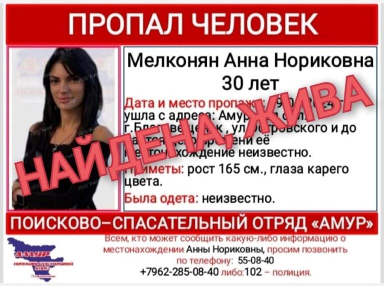 Как ранее сообщало Амур.инфо, 9 апреля без вести пропала Анна Мелконян. Сегодня, 12 апреля стала известна её судьба.