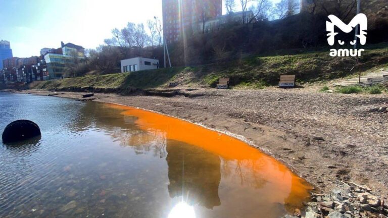 На кадрах – бухта Фёдорова. Вода здесь стала оранжевой. Вот только тревогу бить не нужно, химикаты ни при чём – на мелководье заплыла ночесветка. Она абсолютно безопасна как для природы, так и для человека.