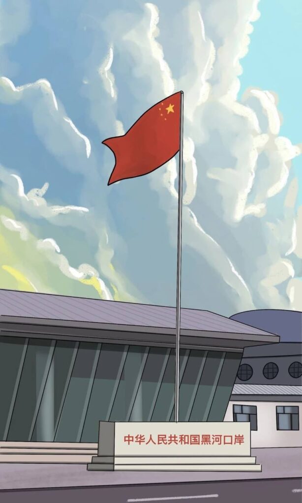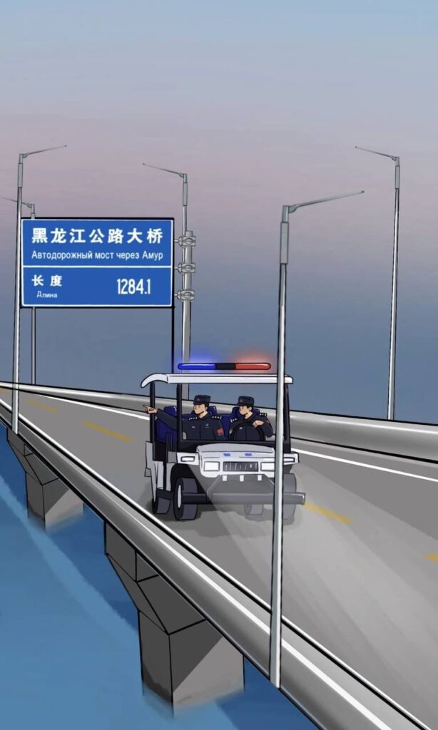 На картинках изображены международный мост через Амур, в том числе и дорожный знак, указывающий длину моста, стойка паспортного контроля в здании речной таможни, а также китайский флаг на фоне таможни Хэйхэ.