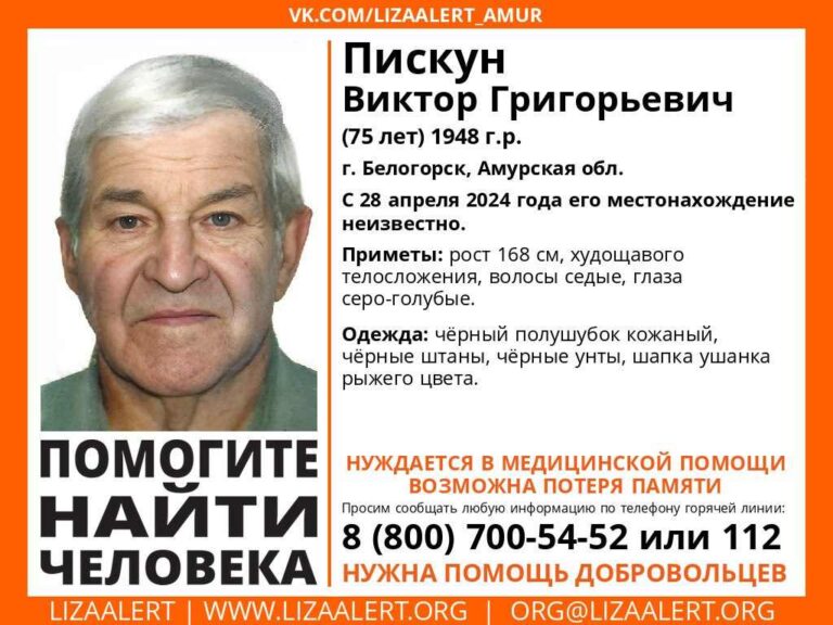 Виктор Григорьевич Пискун 1948 года рождения ушёл из дома в Белогорске. Его рост 168 сантиметров, он худощавый, седоволосый, глаза серо-голубые. На момент исчезновения был одет в чёрный кожаный полушубок, чёрные брюки, такого же цвета унты, ушанку рыжего цвета.