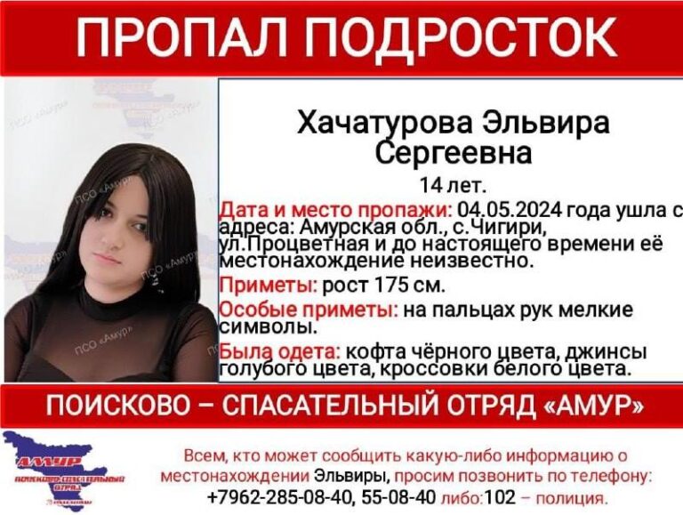 В субботу, 4 мая, в селе Чигири Благовещенского округа пропала 14-летняя Эльвира Хачатурова. Подросток ушла с улицы Процветания. До сих пор ее местоположение неизвестно. Об этом сообщили в поисково-спасательном отряде «Амур».