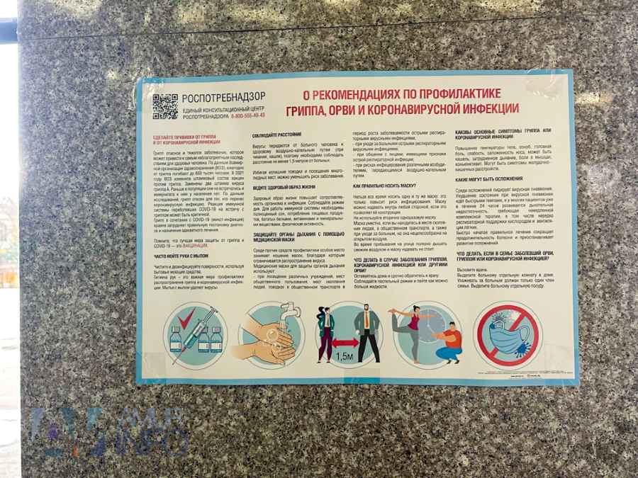 В холле ОКЦ нас встретили сразу два «артефакта» времён COVID-19: антисептик, заполненный на одну треть, но исправно выполняющий свою функцию, и плакат от Роспотребнадзора с информацией о коронавирусе.