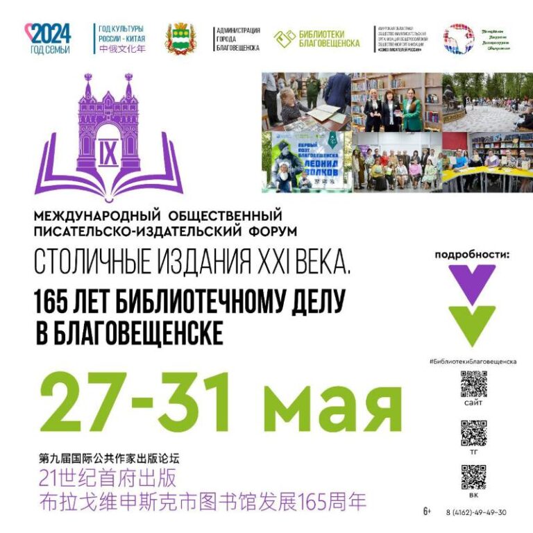 27 мая в Благовещенске стартует IX Международный общественный писательско-издательский форум под названием «Столичные издания XXI века. 165 лет библиотечному делу в Благовещенске». Об этом сообщает официальный сайт библиотек Благовещенска.