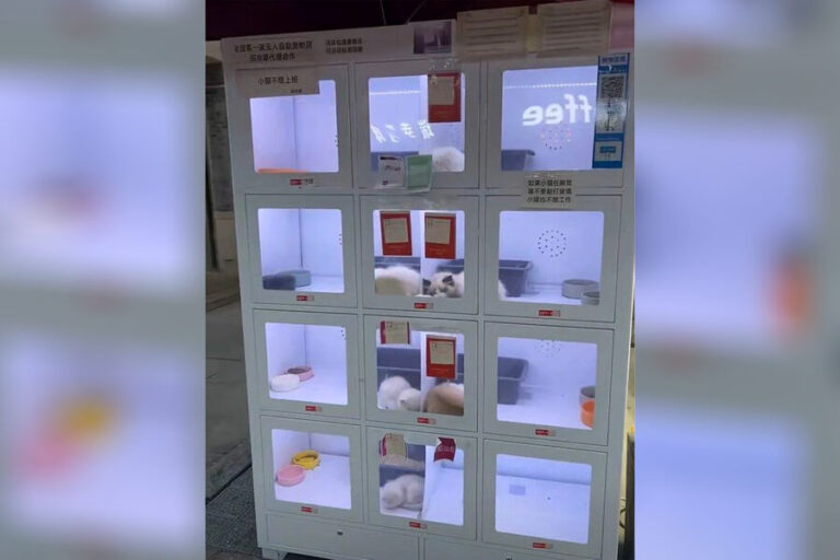 На улице Пекина появились автоматы, продающие домашних питомцев. Устройство представляет собой большой прозрачный ящик, разделённый на несколько секторов, в котором живут кошки и собаки.