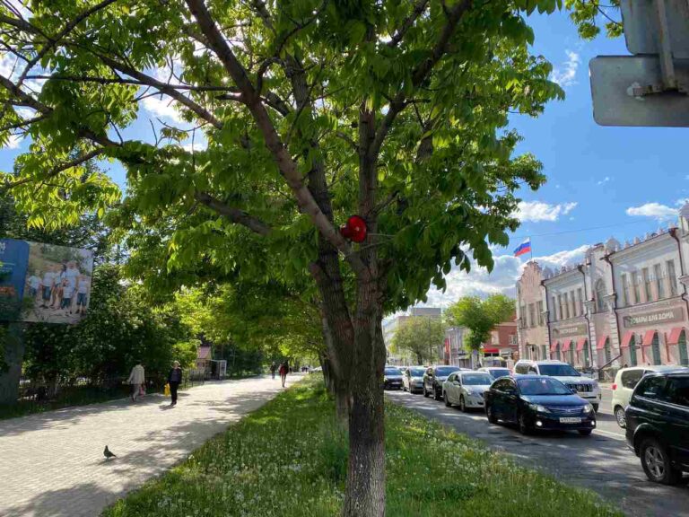 На кадрах, которые прислала благовещенка, действительно слышно, насколько громко звучит реклама из красного рупора, примотанного к дереву. Не заметить его просто невозможно.