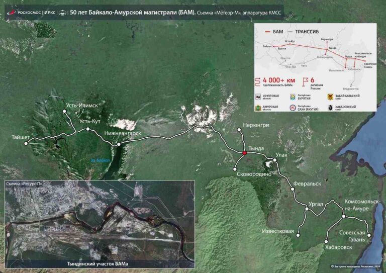 В честь 50-летия Байкало-Амурской магистрали Роскосмос показал, как главная дальневосточная железная дорога выглядит из космоса.