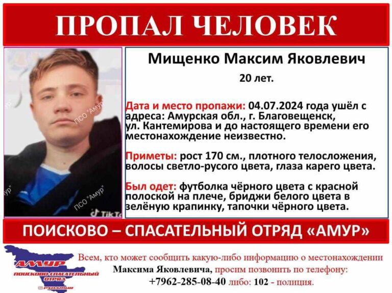 В Благовещенске ищут 20-летнего Максима Яковлевича Мищенко. Молодой человек ушёл с адреса на улице Кантемирова 4 июля, где находится сейчас – неизвестно. О поисках благовещенца сообщил ПСО «Амур».