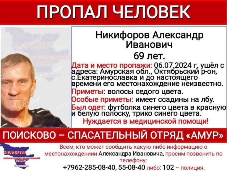 Житель села Екатеринославка Октябрьского района ушел из дома 6 июля, и до настоящего времени его местонахождение неизвестно. Мужчине 69 лет, и он нуждается в медицинской помощи, уточнили в поисково-спасательном отряде «Амур».