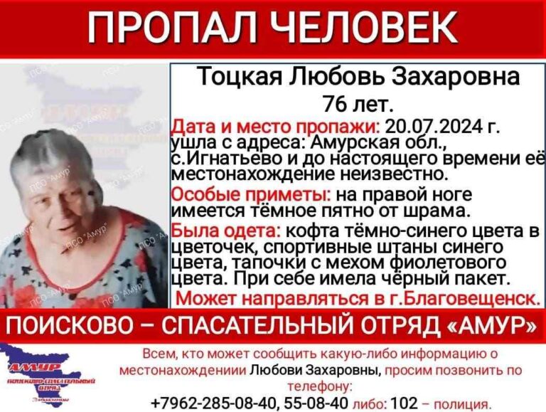 В Амурской области ищут 76-летнюю Любовь Захаровну Тоцкую. Пенсионерка пропала в субботу, 20 июля. Она ушла с адреса в селе Игнатьево. Как сообщили в поисково-спасательном отряде «Амур», пожилая женщина может направляться в Благовещенск.