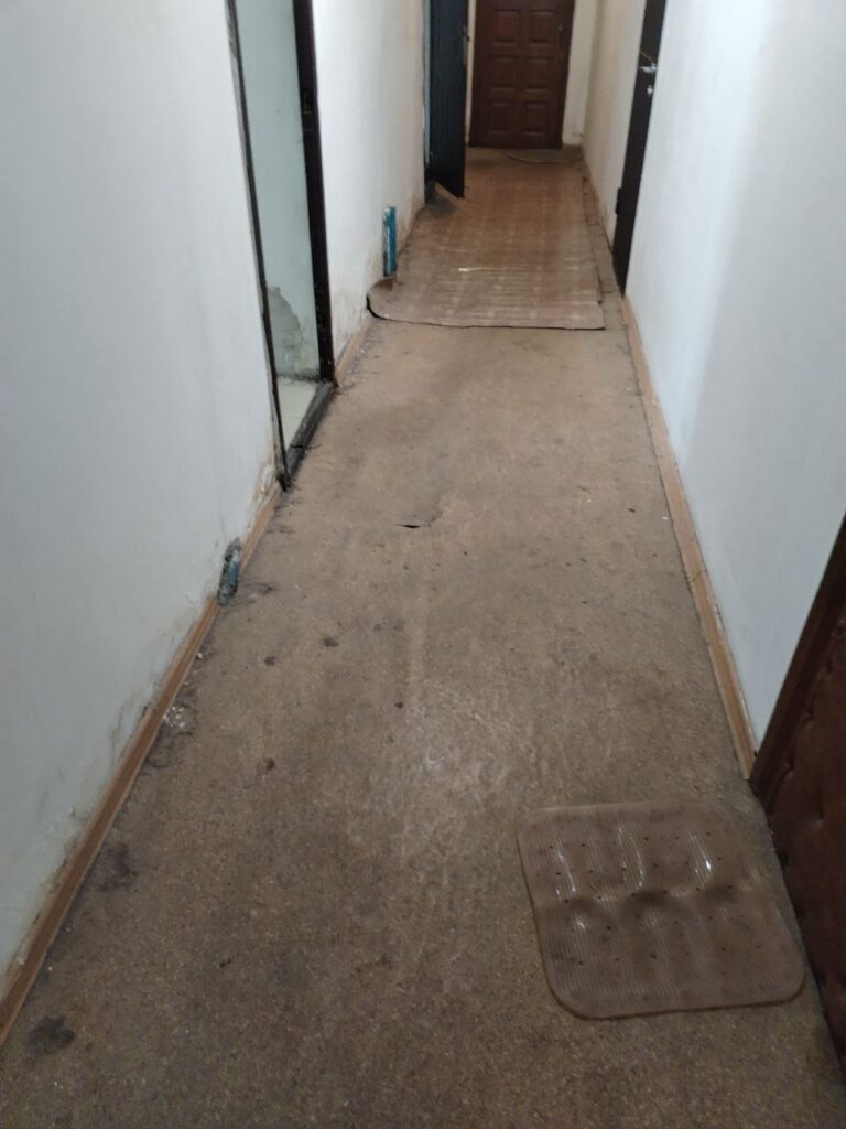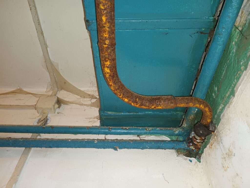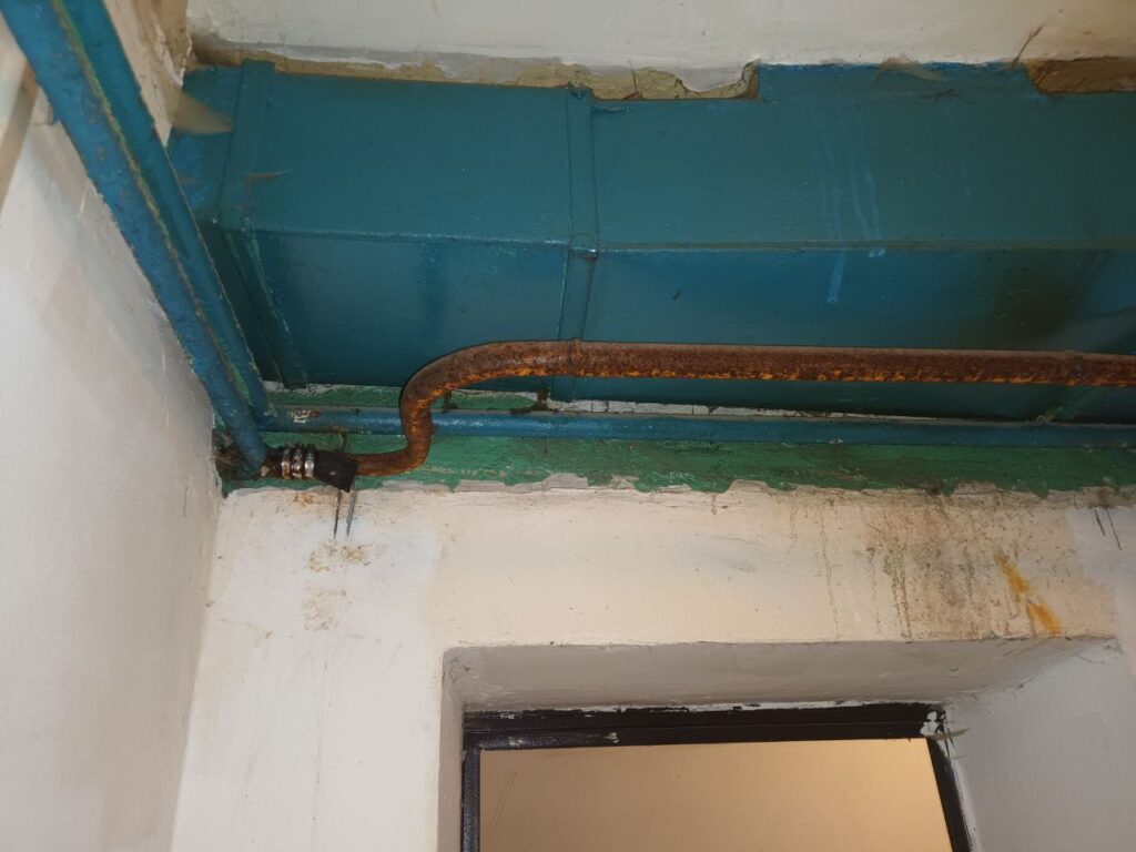 Тепловой узел затоплен канализацией, трубы водоснабжения проржавели, их ремонт был только косметический, пол в коридоре кривой и с порванным линолеумом.