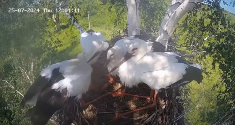 Напомним, 23 июля стало известно о том, что один из недавно вставших на крыло птенцов не возвращался в гнездо несколько дней. Специалист даже предположил, что есть вероятность того, что молодой аист потерялся. Но в обеденное время 25 июля «блудный сын» вернулся, вызвав переполох в гнезде.