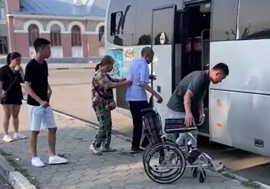 Он запечатлел момент, когда туристы садились в автобус. Инвалиду пришлось встать со своей коляски и на обессилевших ногах при помощи сопровождающей женщины пробираться в салон транспорта.