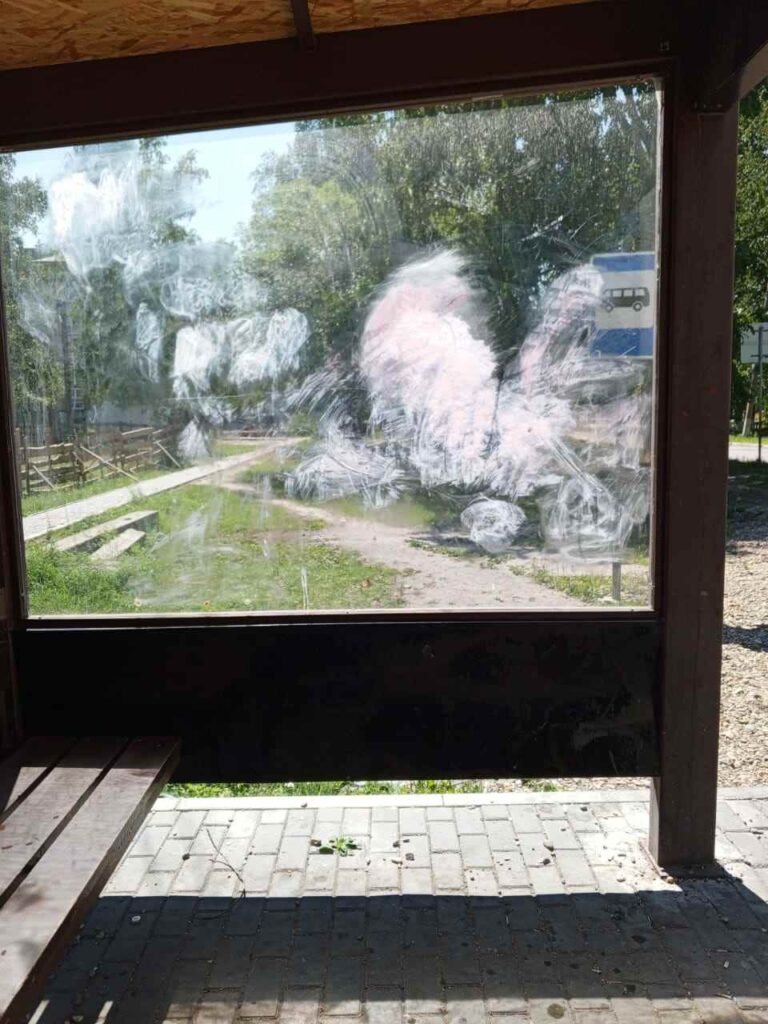 Нападению подверглась новая школьная остановка в микрорайоне «Гарнизон» на улице Школьной. Вандалы исписали надписями весь павильон. Их попытались оттереть, но безуспешно – вернуть первоначальный вид сооружению не удалось.
