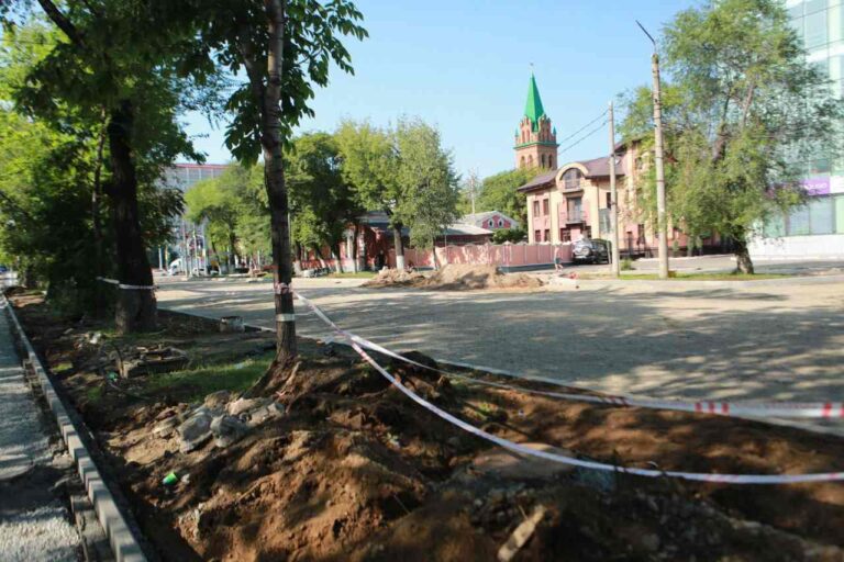 На первой дорожники работают на отрезках от Красноармейской до Горького – перекладывают тротуар, ставят бортовые камни, готовят основание под асфальт, от Горького до Амурской – разрабатывают траншеи под ливневую канализацию.