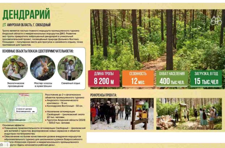 В их число вошла экотропа «Дендрарий» в Свободном, созданная в 2022 году. Она расположена на территории площадью 25 гектаров и состоит из трех пешеходных маршрутов общей протяженностью 5,7 километра.