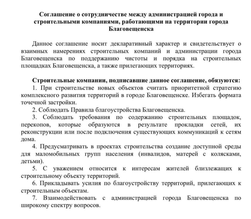 Городские власти предложили строительным компаниям, работающим на территории Благовещенска, подписать соглашение о сотрудничестве. Его текст градоначальник опубликовал в своем телеграм-канале.