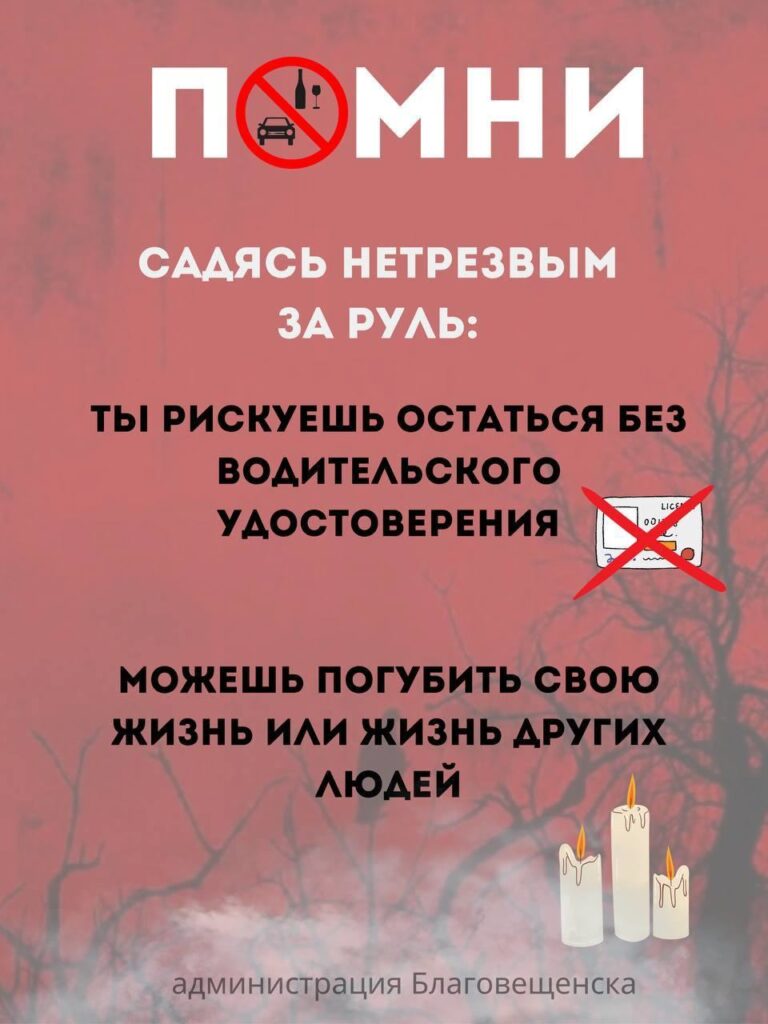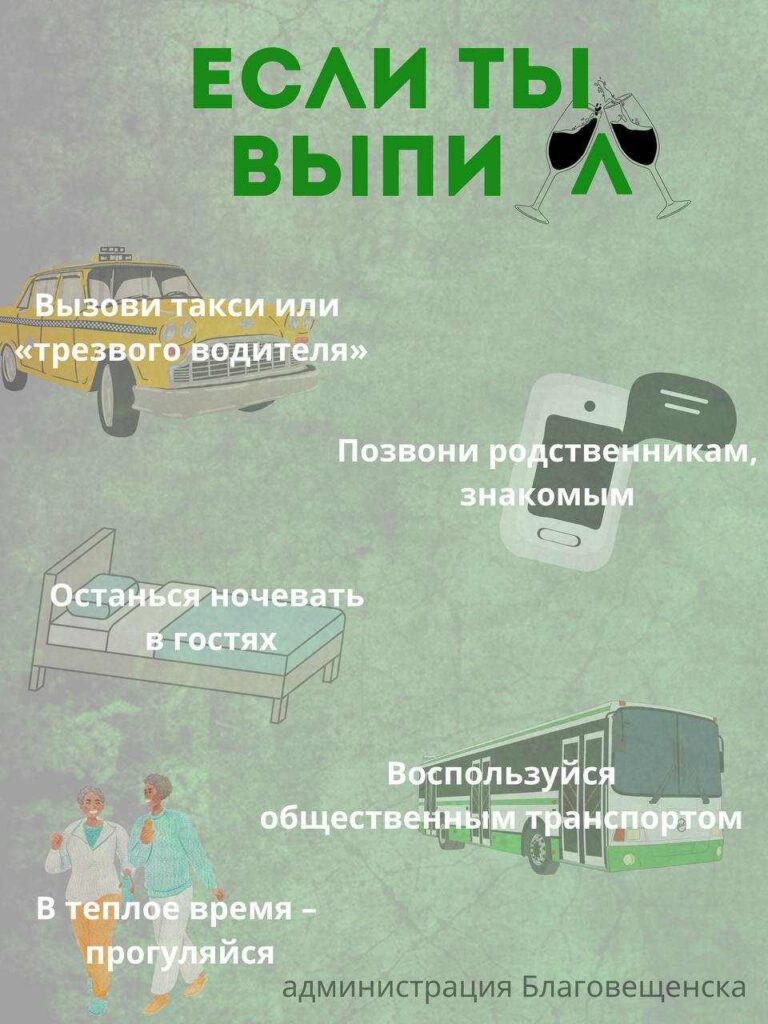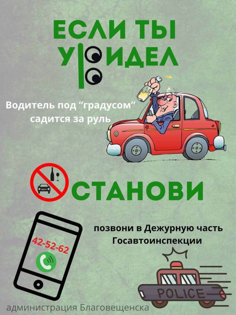 — Амурчане, проявляйте свою гражданскую сознательность. Если видите, что нетрезвый человек пытается сеть за руль, сообщите в полицию, тем самым предотвратив беду, – призвали в министерстве.