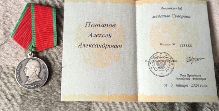 — На еженедельном заседании муниципального оперштаба по помощи семьям участников СВО в администрации Серышевского муниципального округа один из кураторов сообщил о радостном известии, которым поделилась с ним мать воина, нашего земляка из села Большая Сазанка Алексея Потапова: Алексей Александрович награжден медалью Суворова. Он простой парень – закончил школу, работал в местном сельхозпредприятии, – с гордостью отметили в местной администрации.