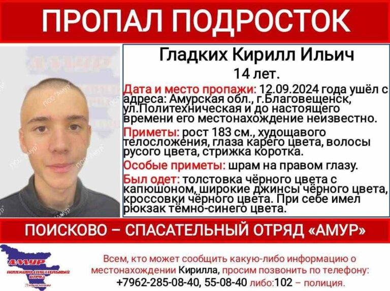 В Благовещенске волонтёры ищут 14-летнего Кирилла Ильича Гладких. Подросток ушёл из дома на улице Политехнической 12 сентября и пропал без вести. О поисках сообщил ПСО «Амур».