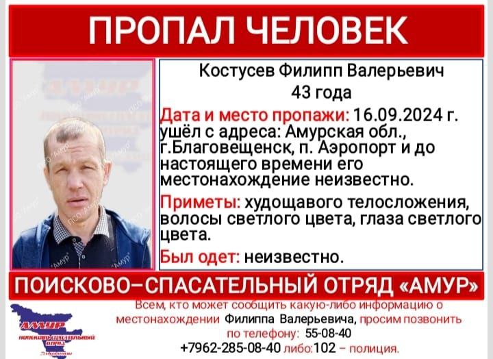 Поисково-спасательный отряд «Амур» разместил информацию о поиске 43-летнего Филиппа Костусева. В последний раз мужчину видели в поселке Аэропорт. Сейчас его местонахождение неизвестно.