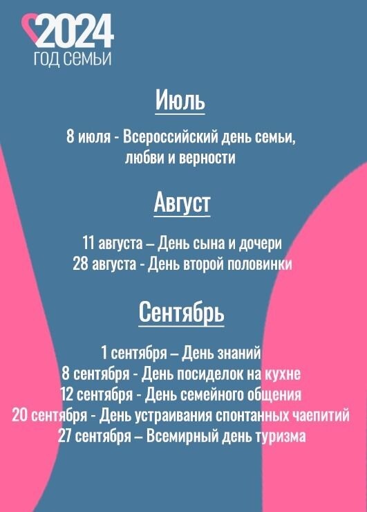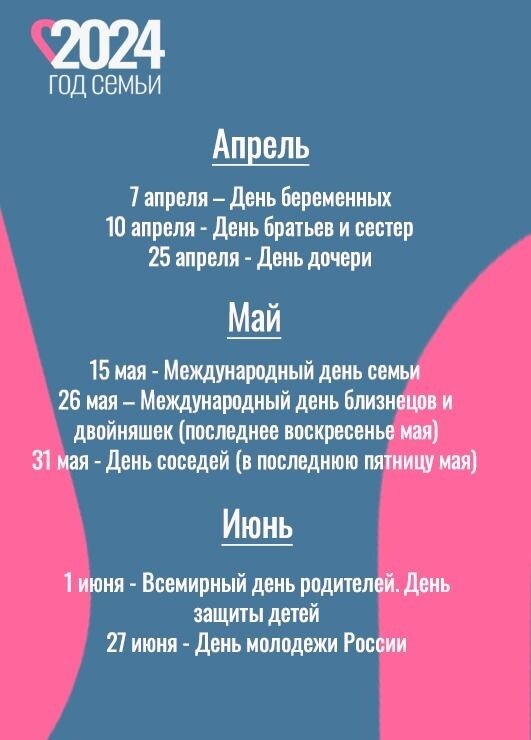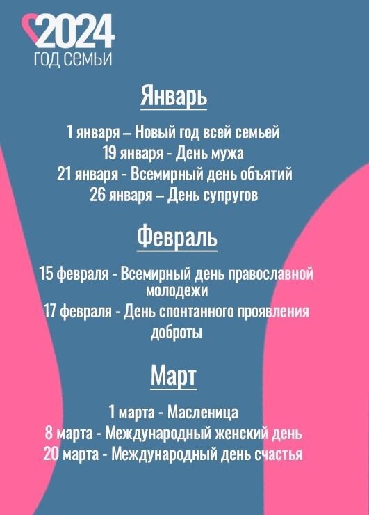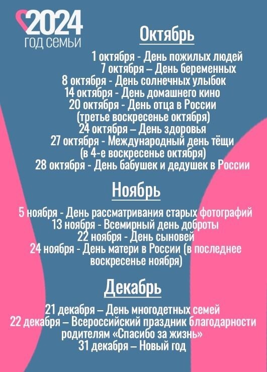 В годовой календарь вошли такие праздники как День беременных, Международный день семьи, День сына и дочери, День пожилых людей, День отца в России, День матери в России, День многодетных семей и другие.