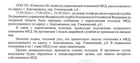 Вынужденно оставаясь ответственным за жилые дома, военное ведомство от этой самой ответственности не укрывается. Как заверили корреспондента Амур.инфо, колодцы прочистили вовсе не специалисты управляющей компании, а сотрудники погранотряда. Сделали они это сразу, в течение трёх часов, после полученного от УК «Комплекс-М» уведомления от 2.10.2024 № 372.
