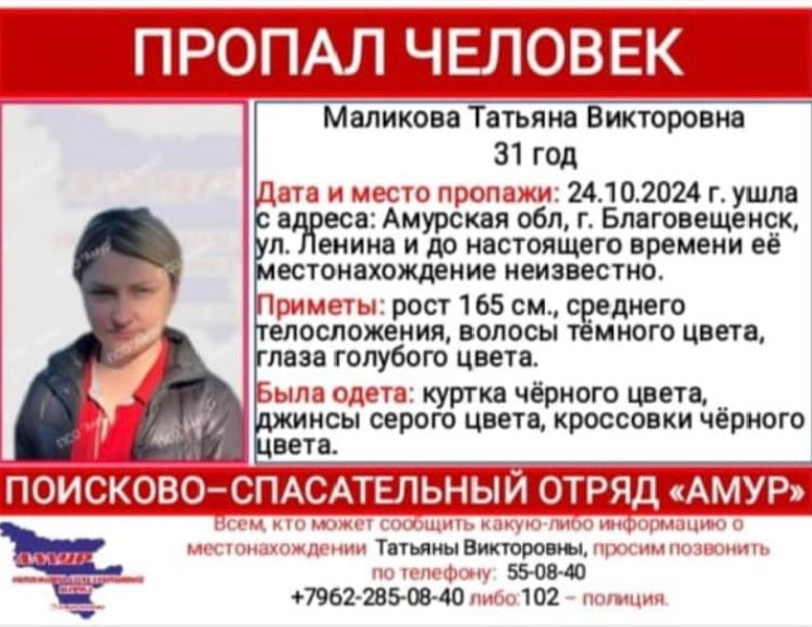 Участники поисково-спасательного отряда «Амур» просят помочь в поисках Татьяны Викторовны Маликовой, 31-летней жительницы областного центра. Женщина ушла с адреса на улице Ленина.