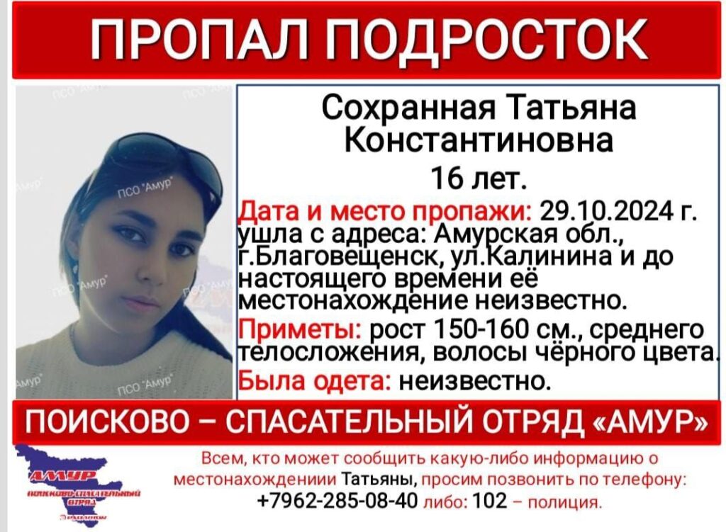 В ПСО «Амур» сообщили, что 16-летняя Татьяна найдена, жива.