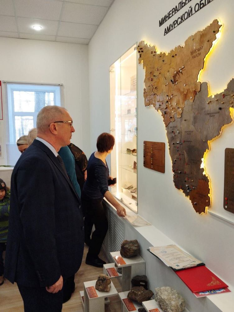 Руководитель музея Марина Чухай особо отметила преображение выставочных залов. Она рассказала, что в первом зале музея, выполненном в светлых тонах, обустроили подиум для крупных экспонатов и ниши с подсветкой для демонстрации минералов. Также Марина Чухай подчеркнула, что внимание посетителей привлекает настенная карта минеральных ресурсов Амурской области, которую изготовил из фанеры зейский мастер Никита Воробьев.