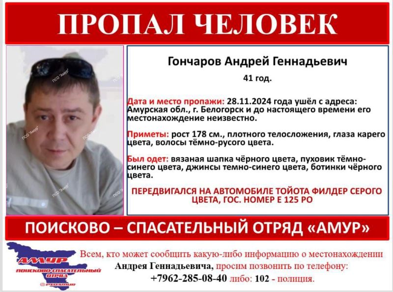 В тот же день уже в Белогорске пропал 41-летний Андрей Геннадьевич Гончаров. Его местонахождение также неизвестно. Рост мужчины – 178 сантиметров. У амурчанина карие глаза и темно-русые волосы. Он был в вязаной черной шапке, темно-синем пуховике, темно-синих джинсах и черных ботинках. Отмечается, что передвигался мужчина на сером автомобиле «Тойота Филдер», госномер машины – Е 125 РО.