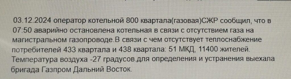 Амур.инфо стало известно об остановке газовой котельной в Благовещенске. По данным от управляющих компаний, газ перестал поступать на котельную по магистральному трубопроводу.
