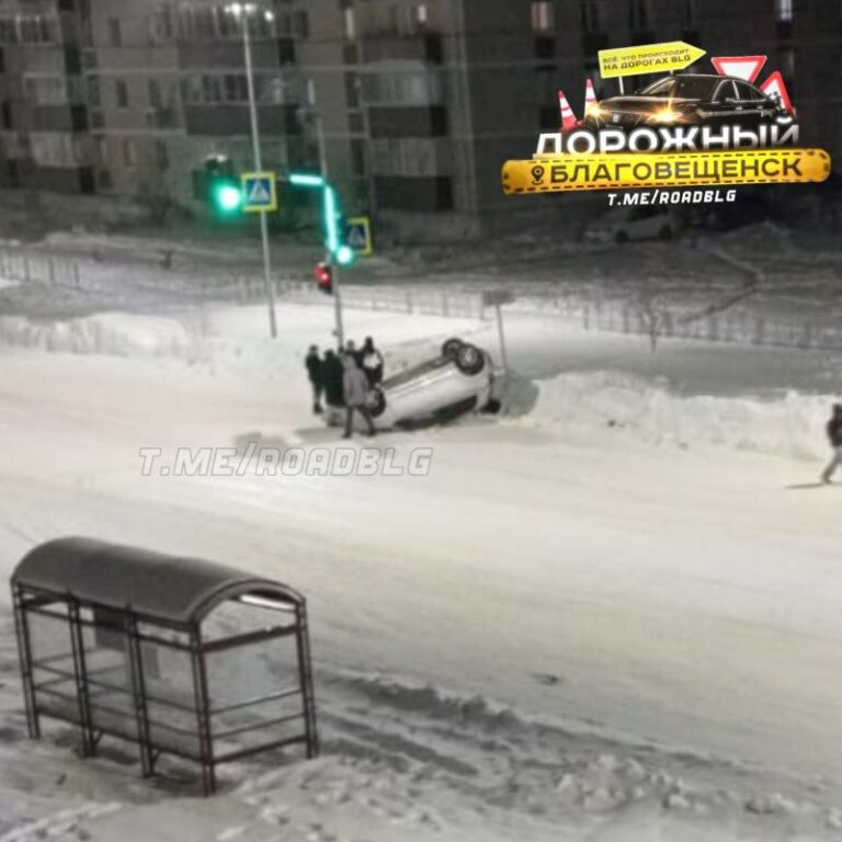 В Благовещенске прямо на проезжей части вверх дном оказался легковой автомобиль. Фото ДТП размещено в телеграм-канале @roadblg.